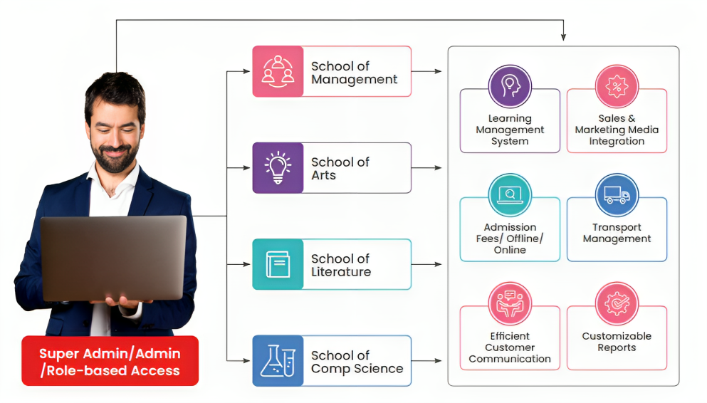 It provides overall count of students, staffs, budget, department wise Income, expenses, course wise performance analysis, vendor pending payments etc. Management will be able to decide and take corrective measures to improve the respective performance.